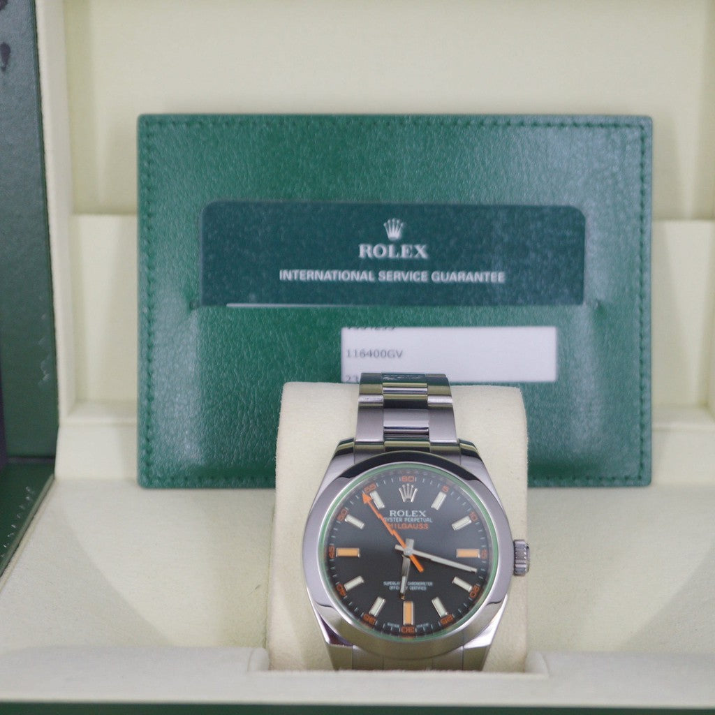 The Rolex Milgauss is a distinctive watch that merges scientific innovation with timeless style. Its striking green sapphire crystal encases a captivating black dial with vivid orange accents, ensuring a unique presence that resonates with modern sophistication. Designed to withstand magnetic forces, it remains a symbol of resilience and precision. The sleek Oyster bracelet and polished bezel add a touch of elegance, making it the perfect companion for both the laboratory and the boardroom. A watch that embodies confidence and innovation in every glance.