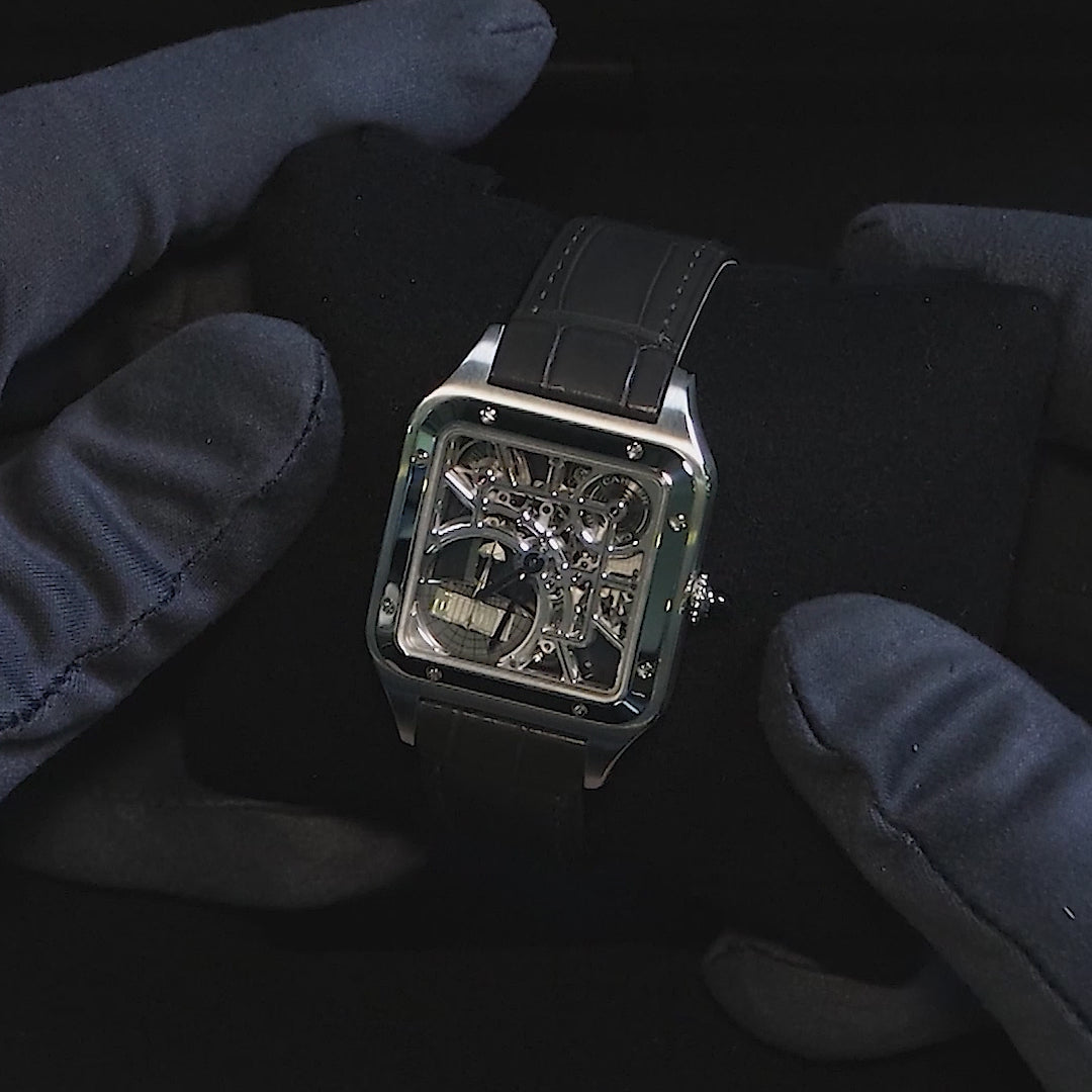The Cartier Santos Dumont in large size pairs a sleek steel case with a striking skeleton dial that reveals its refined mechanics. Roman numerals and blued hands keep the look timeless and clear. Finished on a smooth leather strap, it wears with effortless elegance from day to evening. Offered with its box and papers, it is a true statement of taste.