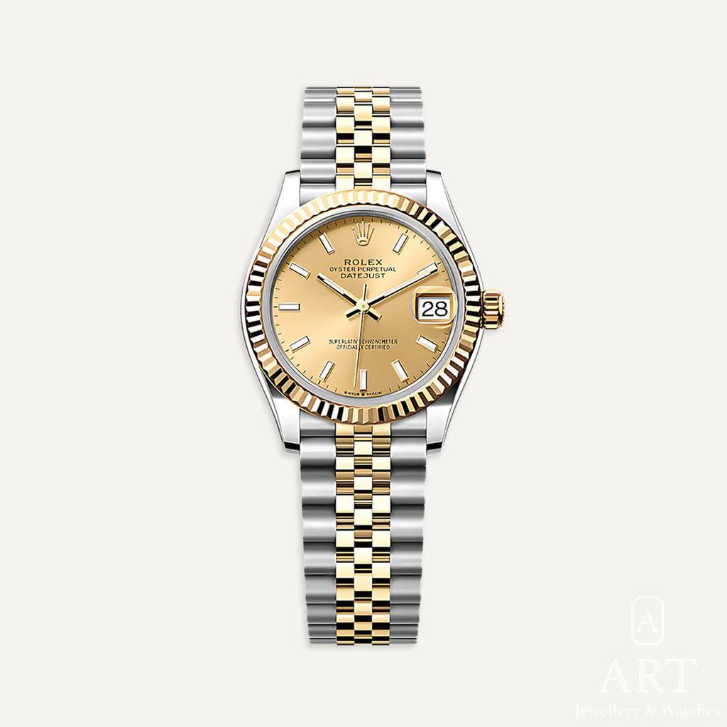 The Rolex Datejust 31mm pairs stainless steel and yellow gold in a timeless design. Its Jubilee bracelet drapes with smooth comfort, while the champagne dial glows with warm elegance under the light. Refined yet versatile, it moves from day to evening with quiet confidence. A classic choice for those who value lasting style and Rolex precision.