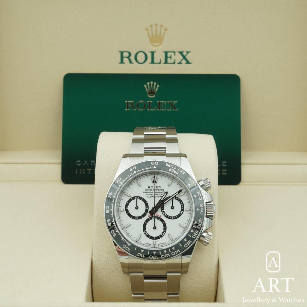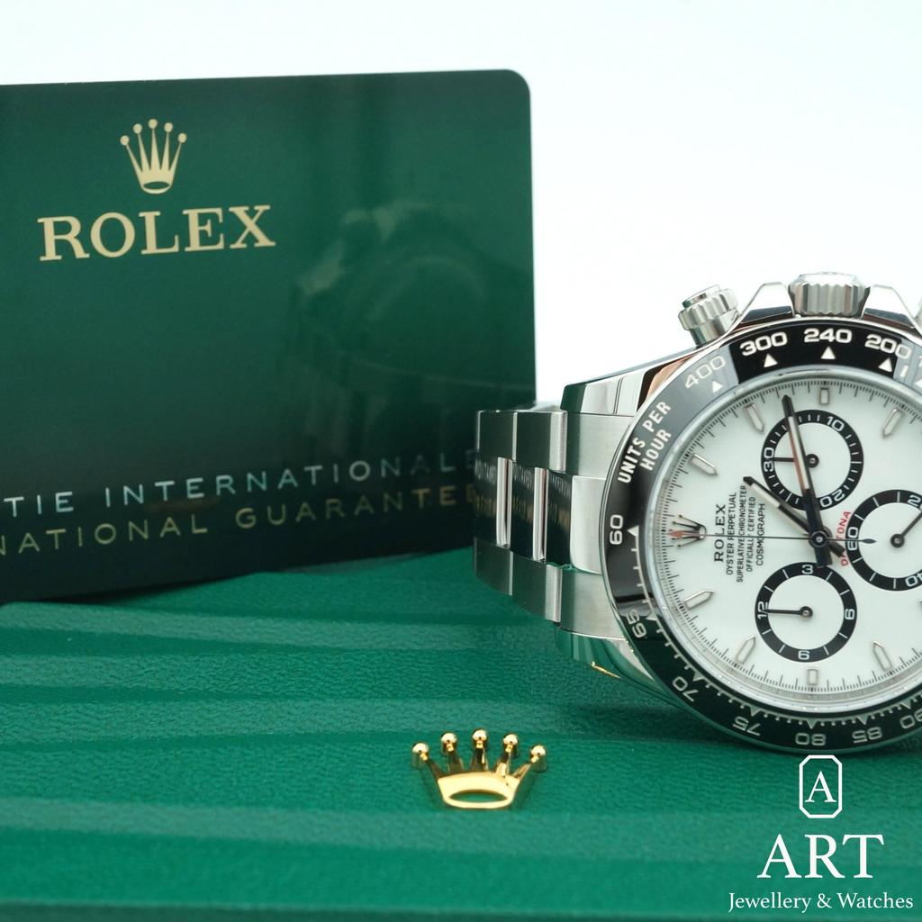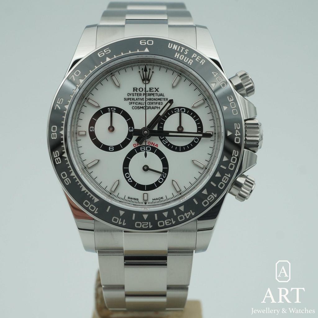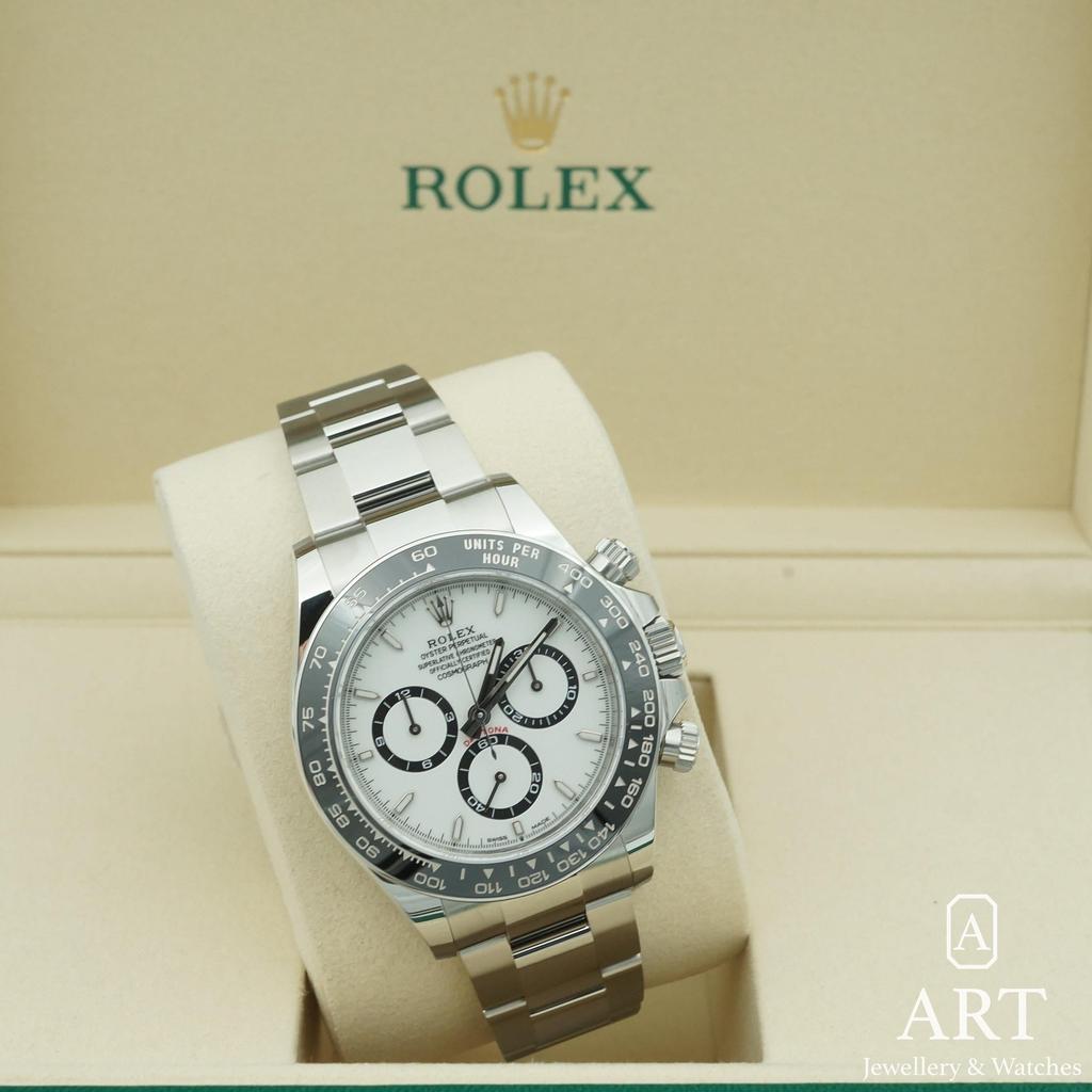 The Rolex Daytona in 40mm steel pairs a crisp white dial with a sleek black bezel for a look that feels both modern and timeless. Its chronograph layout is clear and balanced, made for speed yet refined for daily wear. Presented with its original box and papers, it is a confident choice for collectors who value style, precision, and lasting appeal.