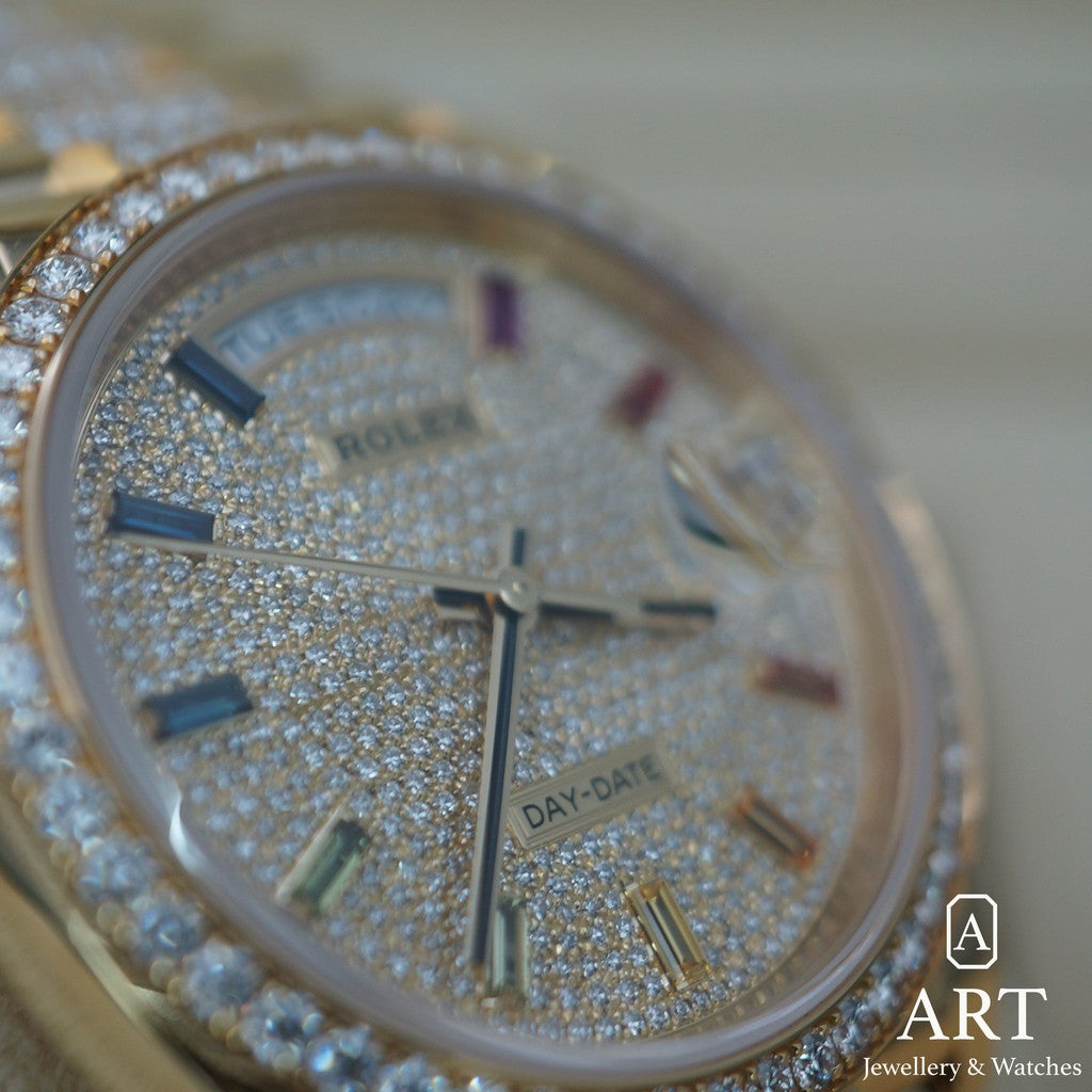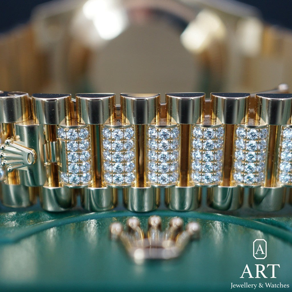 Sarı Altından üretilen 40 milimetrelik Rolex Day-Date referans 228348RBR, kusursuz işçiliğiyle saf lüks ve zarafeti gözler önüne serer. Zümrüt kadranıyla, hem günlük hayatınıza hem de en özel anlarınıza kraliyet esintisi katar. Pırlanta bezeli ve President bileziği, ayrıcalık ve başarının sembolleri olarak her bakışta hayatı ve kazanımları kutlar. Sonsuz zarafet ve liderlik duruşunun güçlü bir ifadesidir.